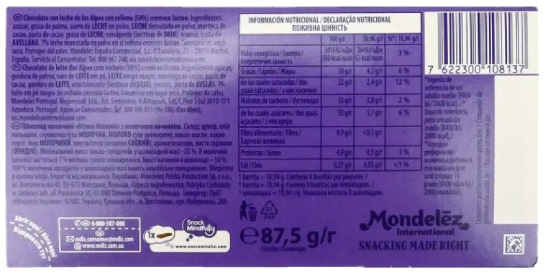 Шоколад виготовлений із використанням альпійського молока, що традиційно гарантує м'якість та високу якість. Начинка складається з ніжної молочної маси та пасти горіха (фундук), що додає легкого горіхового аромату. Продукт універсального призначення, він чудово підходить як десерт до чаю, так і як швидке джерело енергії.