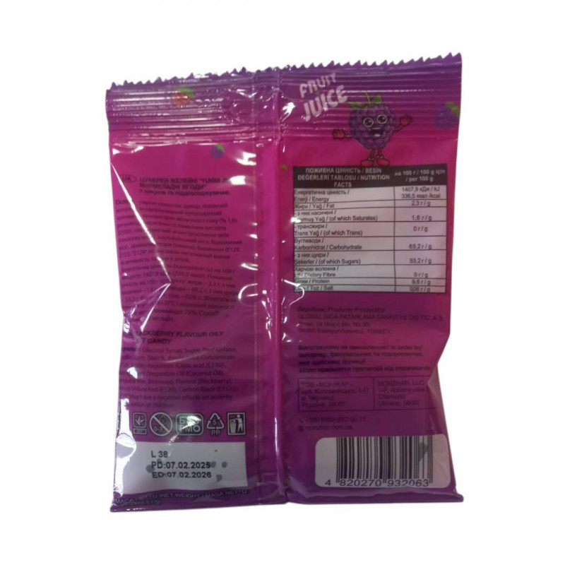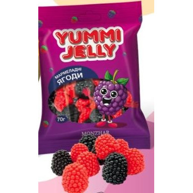 Виробник: Україна. В упаковці – 70 г. Yummi Jelly – жувальний мармелад з різним виглядом і смаком. З натуральним соком; зручна упаковка
