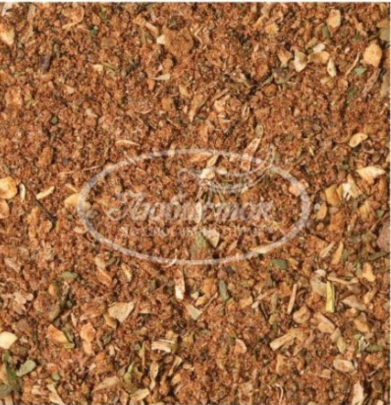 Склад: сіль кухонна (34%), цибуля та часник сушені гранульовані, перець червоний мелений паприка, прянощі сушені подрібнені: плоди коріандру, томати змелені, насіння кропу, перець чорний, базилік, імбир, перець червоний гострий, шавлія, лист лавровий, гвоздика, кардамон, мускатний горіх, перець духмяний. Може містити сліди селери та гірчиці.